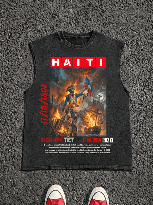 01-Koupé Tèt, Boulé Kay — Sleeveless Vintage Tee (Black)